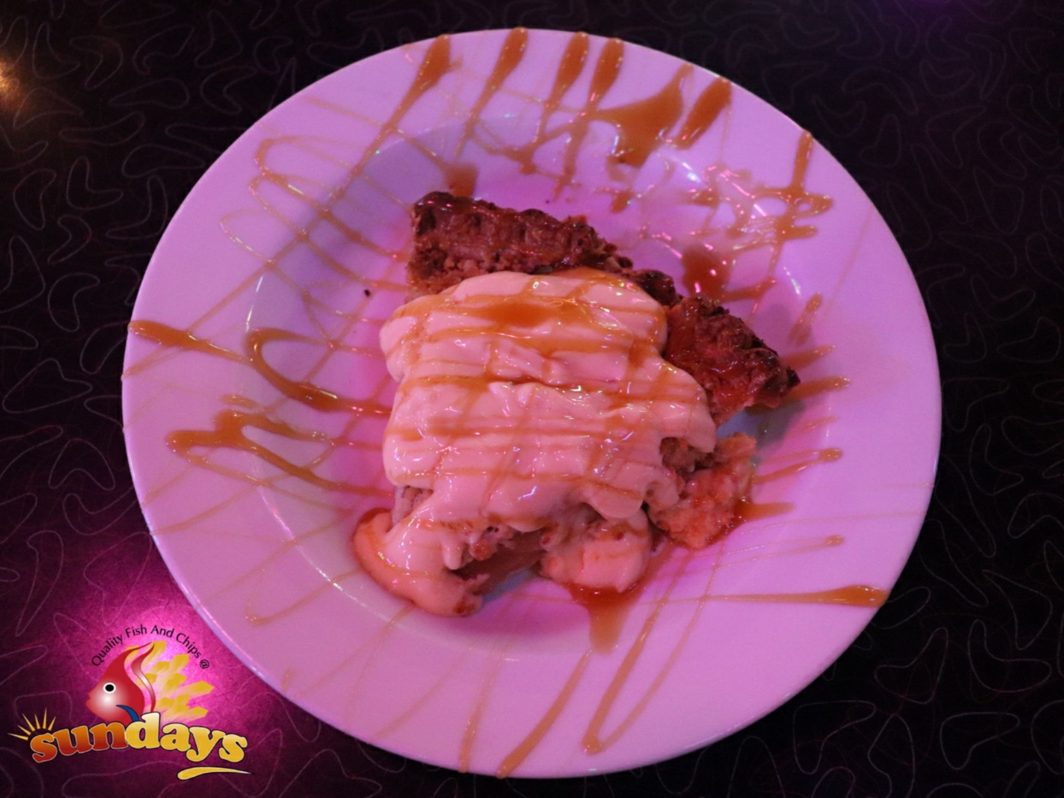 2 traditional English sausages, sautéed onions, and mushrooms over a fluffy mashed potato topped with onion gravy.