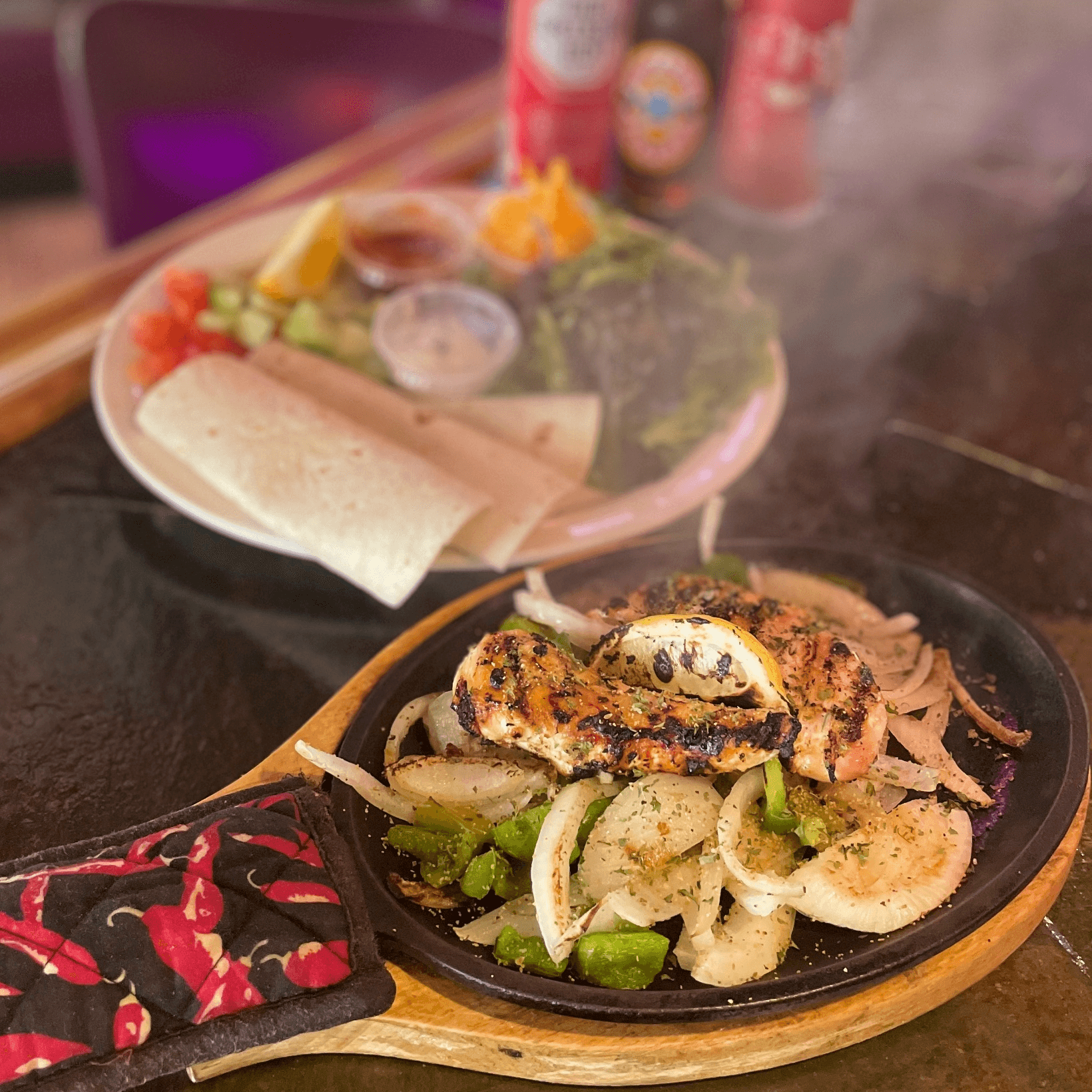 A sizzling skillet of chicken with sautéed peppers, mushrooms, and onions served with mixed greens, hot chili sauce, tzatziki, and flour tortillas.