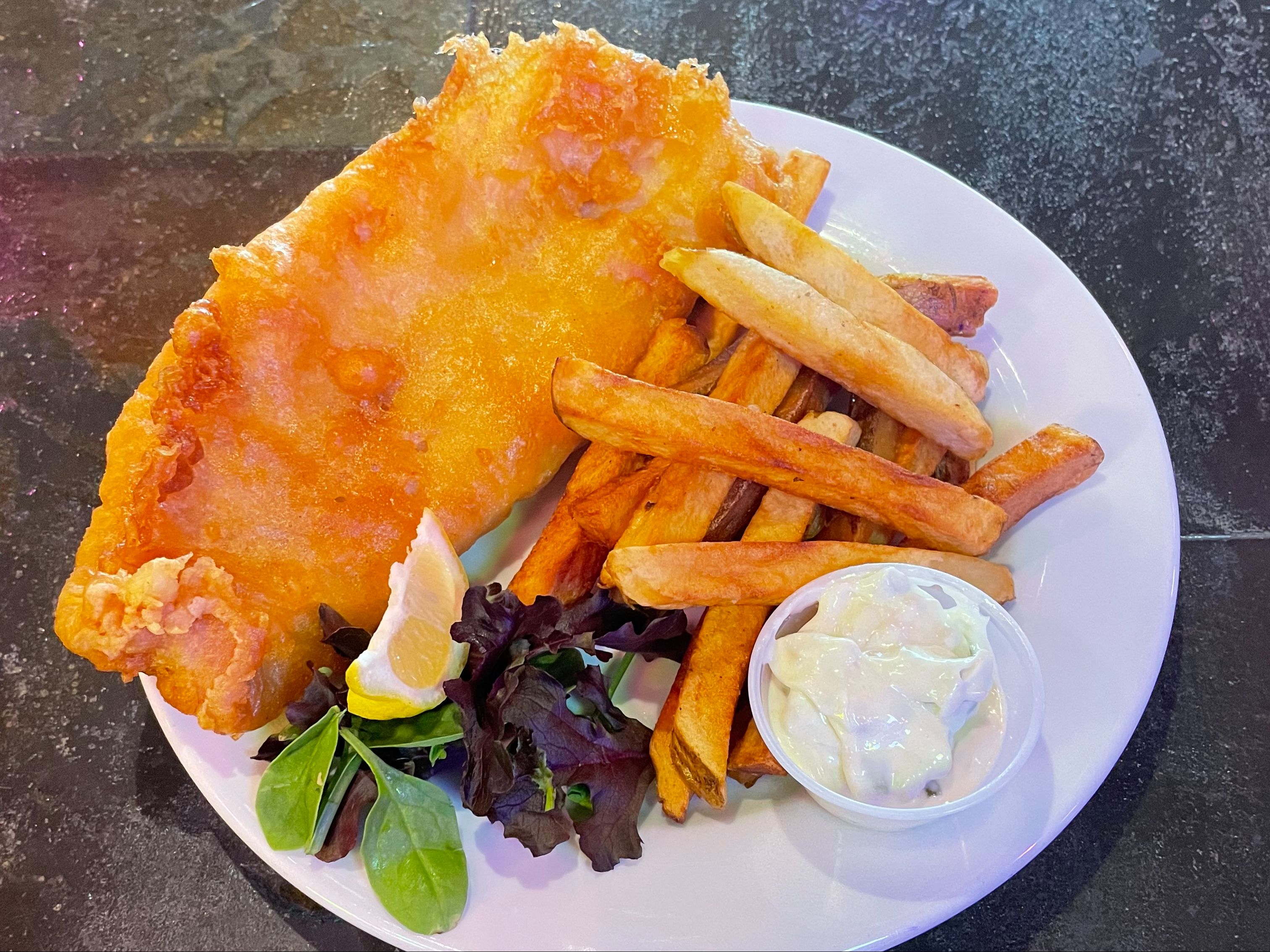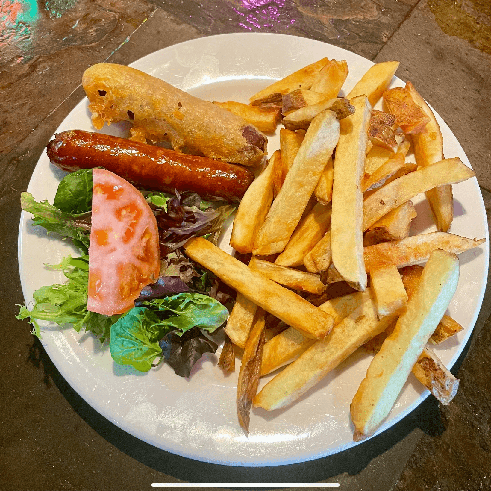 2 traditional British bangers served with our hand-cut chips (battered optional).